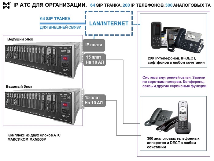 Например, возможна конфигурация, в рамках которой внешняя связь обеспечивается только по IP, а внутренняя связь — аналоговыми абонентскими устройствами (до 140 ) и, при необходимости, IP-телефонами и софтфонами.