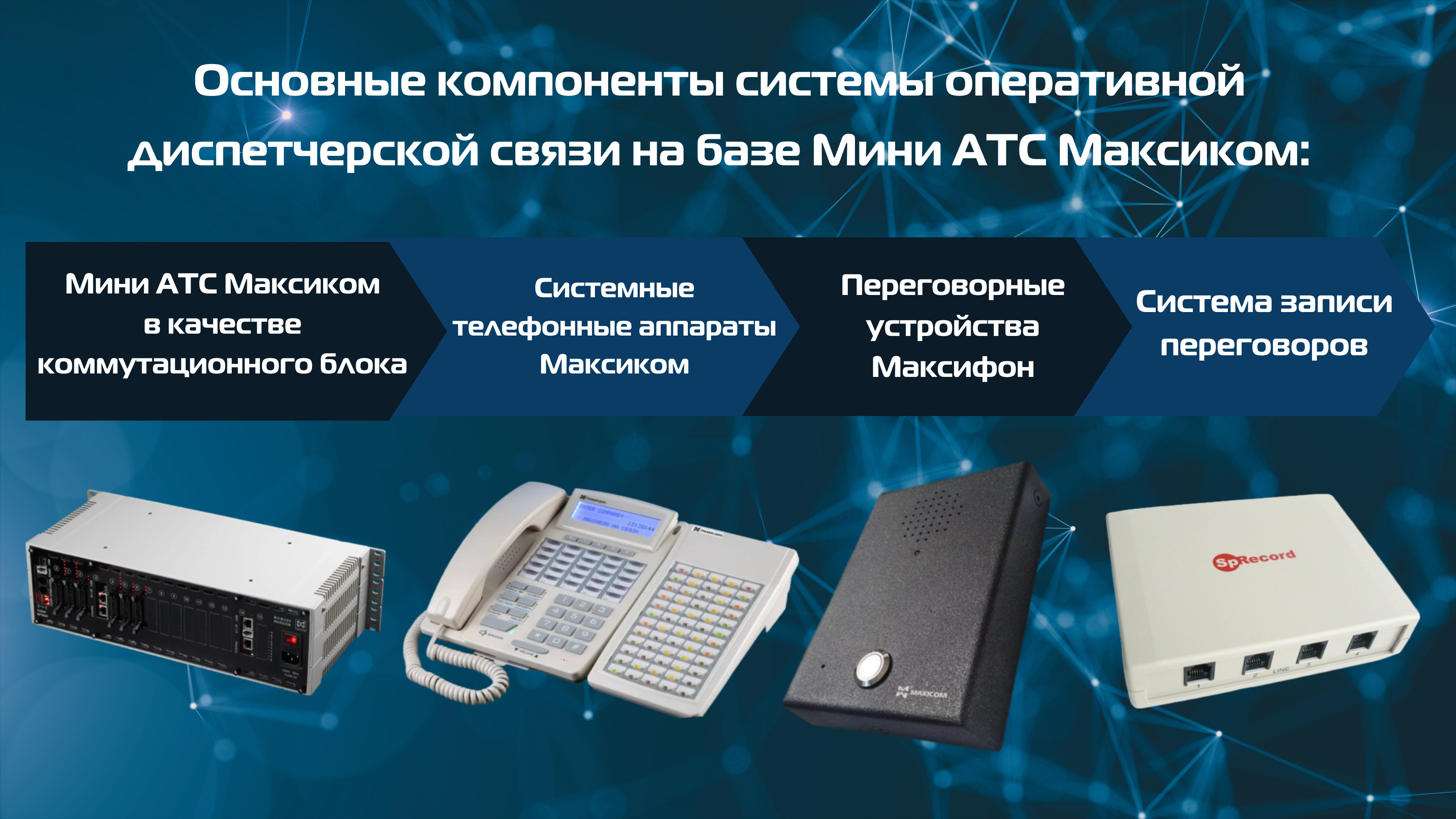 - Основными компонентами такой системы связи выступают цифровая АТС Максиком MXM500P, цифровые системные телефонные аппараты Максиком и телефонные аппараты, переговорные устройства Максифон. Предусмотрена функция записи переговоров на ПК,